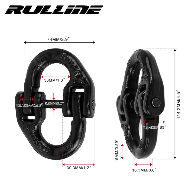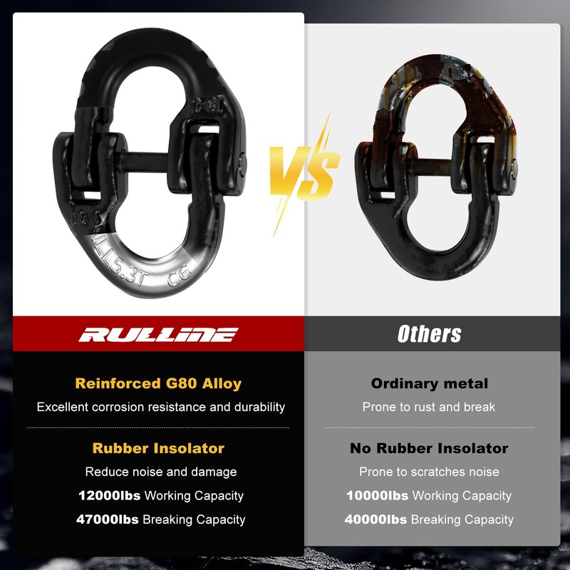 ENHANCED DURABILITY: Crafted from robust G80 alloy steel, the Hammerlock Coupling Link boasts exceptional corrosion and wear resistance. With a remarkable maximum load-bearing capacity of 12000lbs and a breaking capacity of up to 47000lbs, it excels in adverse weather conditions and any terrain.