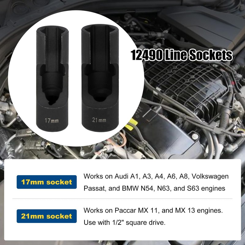 Optimized Socket Sizes: Includes both 17mm and 21mm sockets, covering a wide range of vehicle models and engine types. The 17mm socket is compatible with Audi A1, A3, A4, A6, A8, Volkswagen Passat, and BMW N54, N63, and S63 engines. The 21mm socket Compatible with Paccar MX 11 and MX 13 engines.