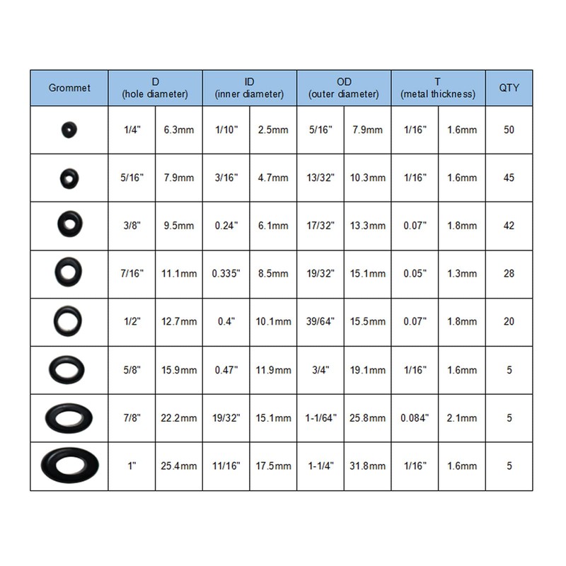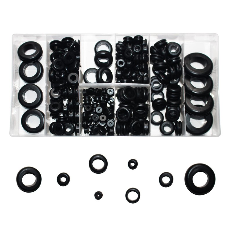 - WHAT YOU GET: Rubber grommets help protect wires from sharp metal edges, dust, and rain. The whole set is conveniently stored in a compact storage box with separate size compartments. You will save a lot of time finding and figuring out the correct size of rubber grommet plug for your needs. The finished product will have a refined look that will reflect on your skills