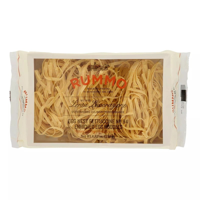 Rummo Fettuccine all'Uovo (no.94) - narrow ribbons of egg pasta that are flatter and wider than linguine and made only from the best quality durum wheat semolina enriched with egg and the purest water from the Sannio Valley to ensure that the pasta consistently has a great flavour, texture and bite.