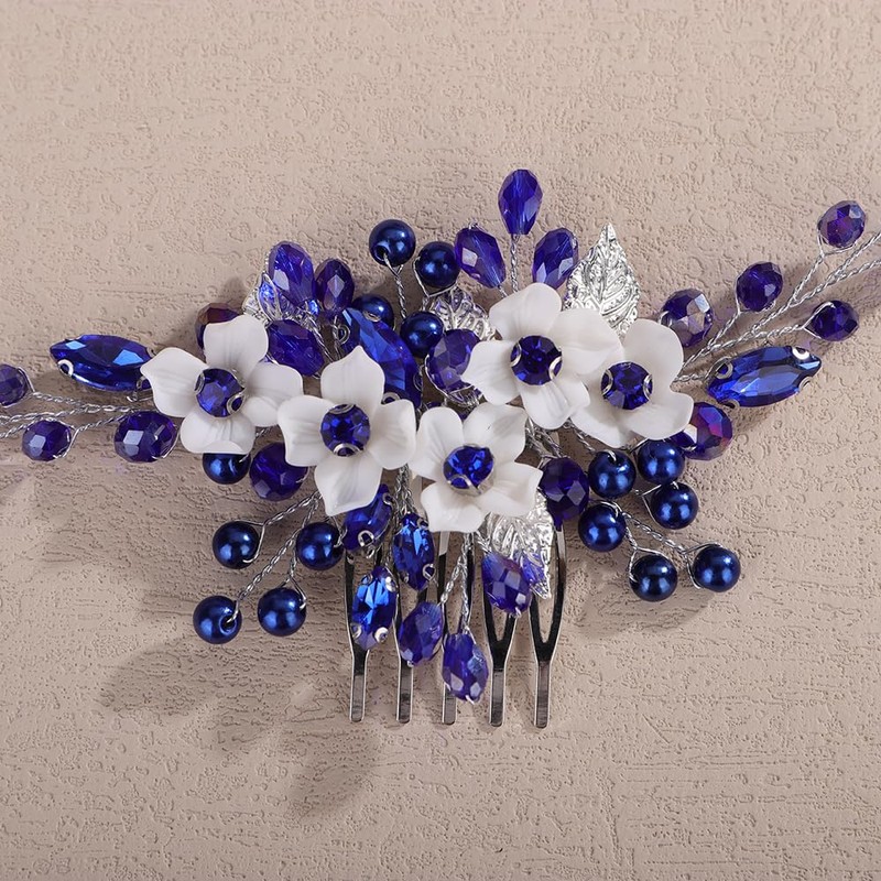 Rumtock Blue Crystal Beads 3D White Rose Flower Hair Comb for Wedding Women B...