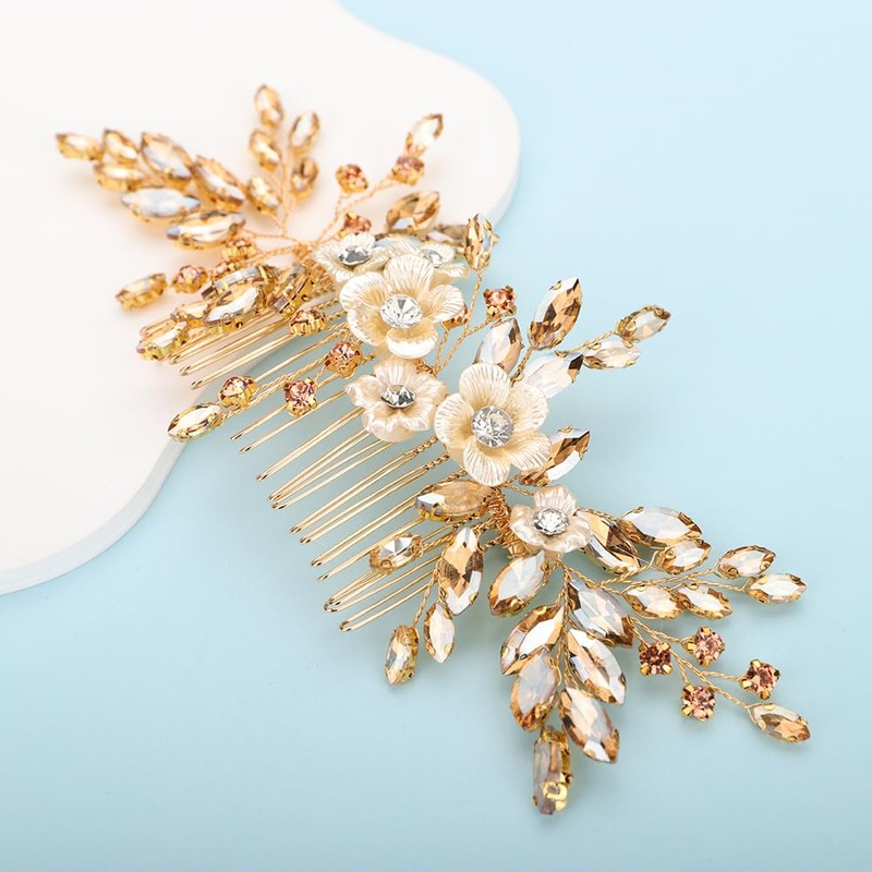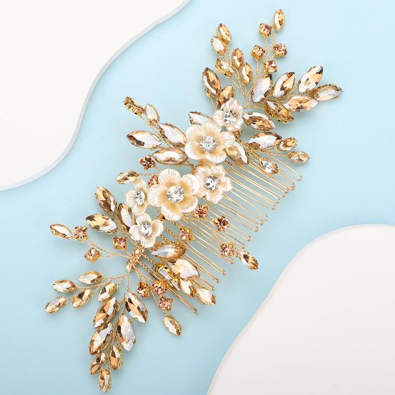 Rumtock Champagne Rhinestones Beads White Flower Hair Comb Wedding Bridal Boho Handmade Hair Accessories (Champagne)