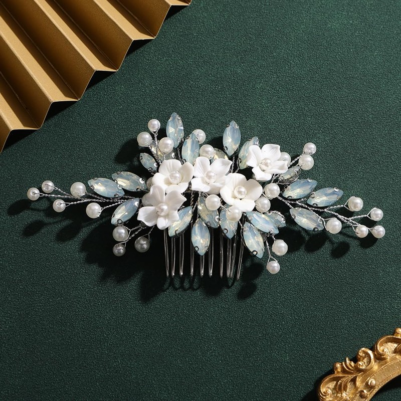 Rumtock Opal Crystal Hair Comb with White Flower Silver Hair Piece for Wedding Brides Bridesmaid Special Occasion Hair Accessories (Silver and Opal)