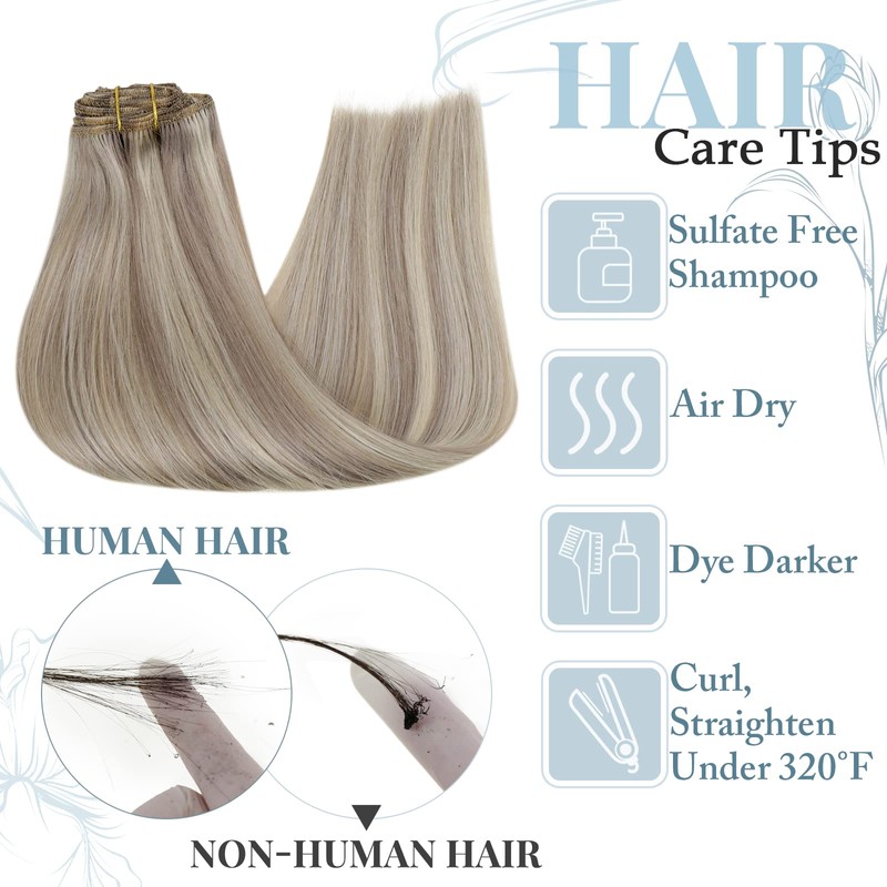 - ♥Our hair extensions clip in human hair can last 3-4 months with good care, can be restyled, strengthened, curled, dyed, etc. When you curl or straighten it, please control the temperature under 250F