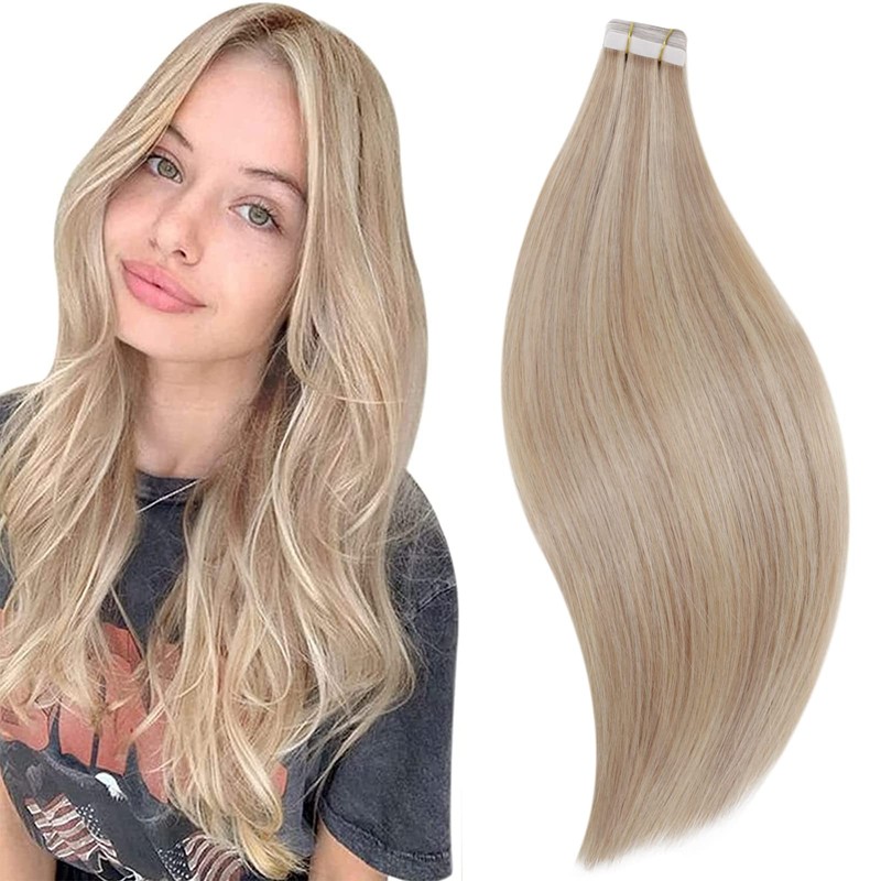 RUNATURE Tape in Hair Extensions Real Human Hair Golden Blonde Highlight Blonde Tape Hair Extensions Remy Invisible Tape Human Hair 18 Inch 50gram #16/24