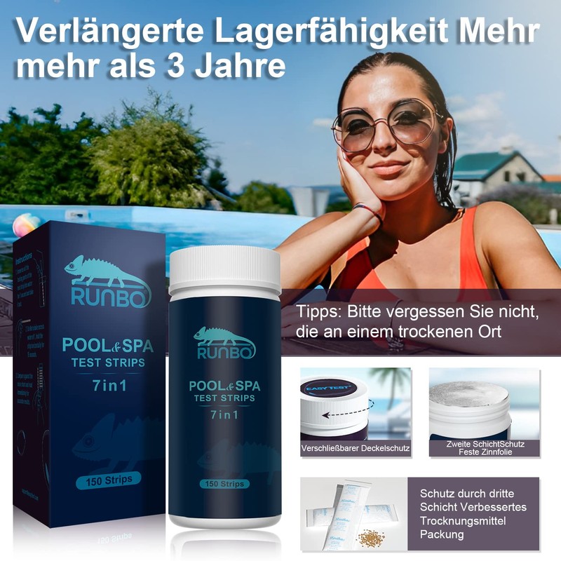 RUNBO 7-in-1 Pool Water Test Strips for PH, 150 Pieces, Water Tester for Spa Swimming Pool, Accurate Test Brom, Total Alkalinity, Free Chlorine, Total Hardness, Cyanuric Acid and Total Chlorine, pH
