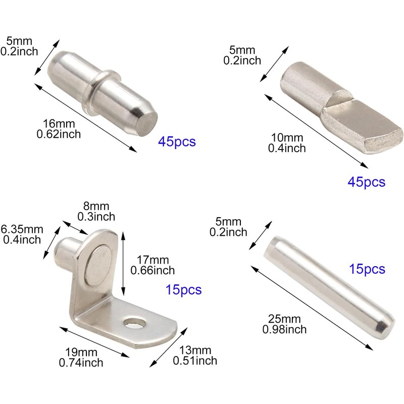 - 👌🏻Product packaging: 45 pieces flat spoon shelf pins + 45 pieces cylindrical shelf pins + 15 pieces L-shaped holder support pins + 15 pieces dowel pins