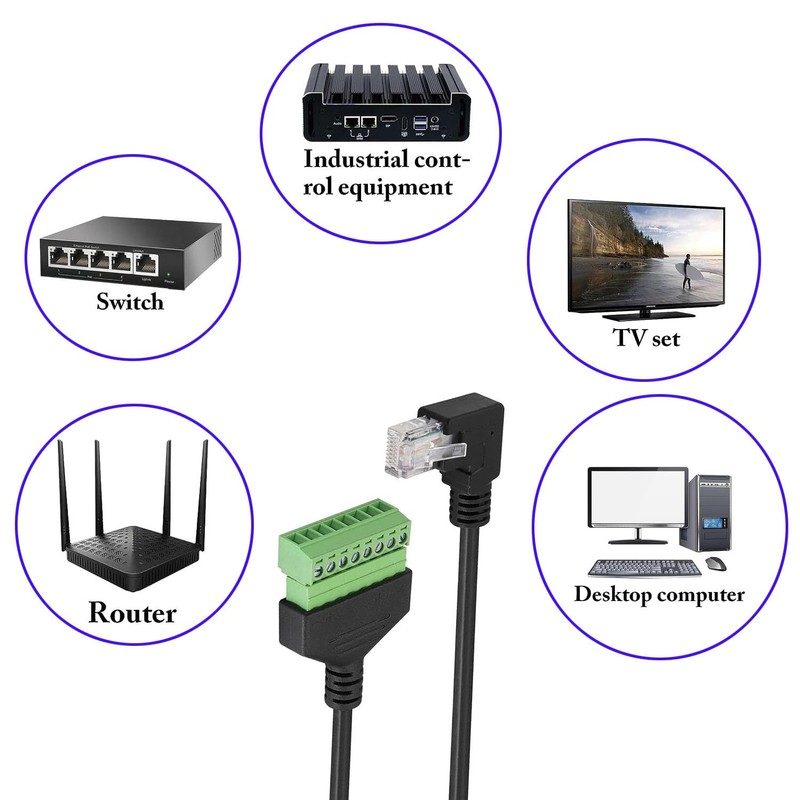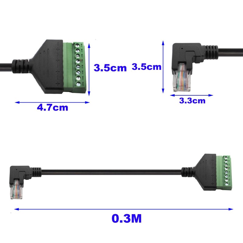 • 👍🏻Cable length: 30 cm. Left bend, Connector 1: RJ45/8p8c male interface; Connector 2: AV 8 pin screw terminal interface.
