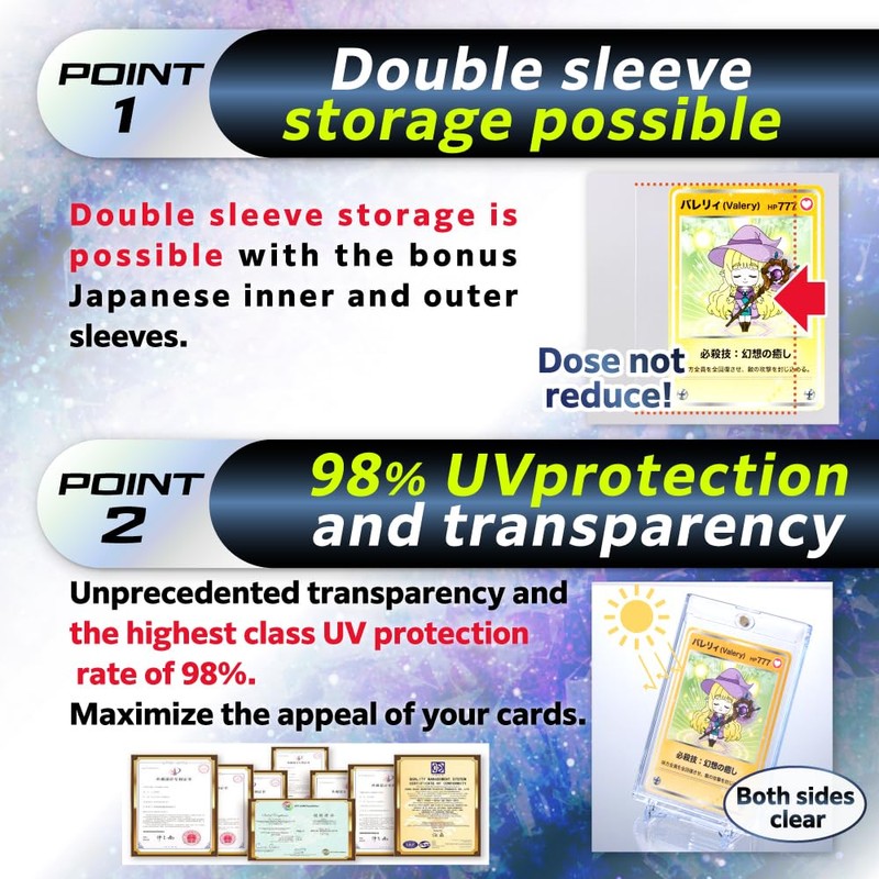- [Best way to store]: The optimal method for storing your trading card game cards is to keep them securely in this double UV cut case.
