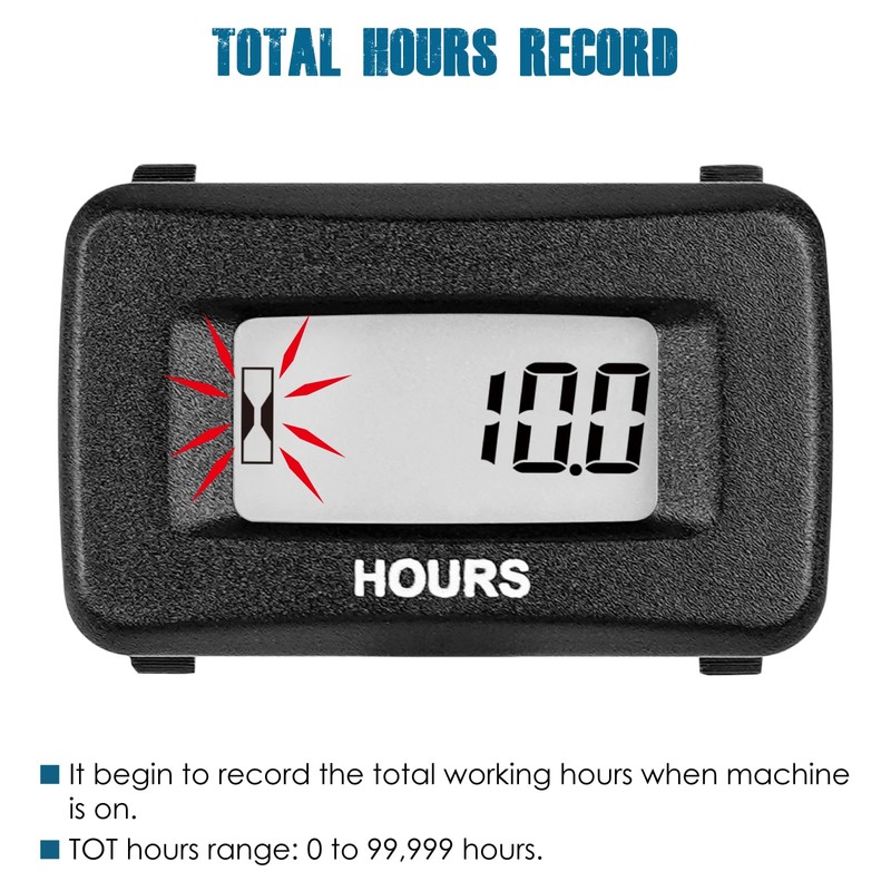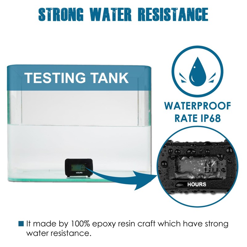- WATER RESISTANCE ---- This hour meter is made by 100% epoxy resin craft, it have strong water resistance and run normally into 10 meters underwater up to standards IP68.