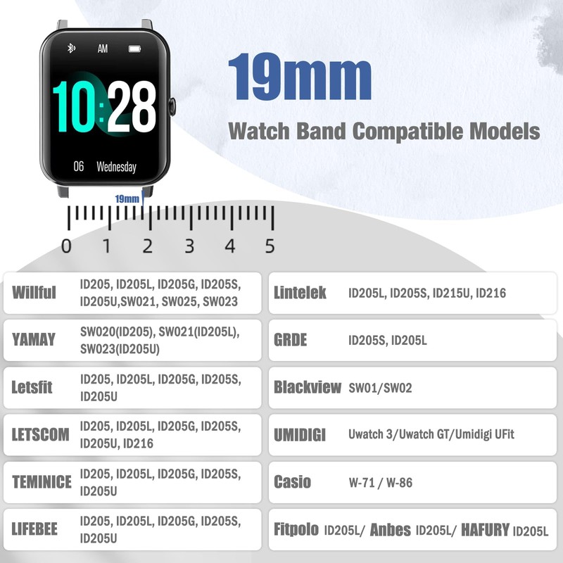 - 【19mm Compatible Models】 Fit for all traditional watch and smart watch with 19mm width watch lugs. Fits for Willful ID205, ID205L, ID205G, ID205S, ID205U, SW021, SW025, SW023; YAMAY SW020(ID205),SW021(ID205L),SW023(ID205U); Letsfit/LETSCOM/TEMINICE/Lintelek/LIFEBEE ID205, ID205L, ID205G, ID205S, ID205U; GRDE ID205S, ID205L; Blackview SW01/SW02; Fitpolo ID205L/Anbes ID205L/HAFURY ID205L; Casio W-71 / W-86; UMIDIGI Uwatch 3/Uwatch GT/ UFit.