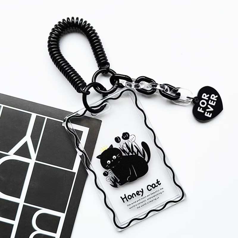 runrayay Acrylic Kpop Photocard Holder, Keychain Clear Black Cat ID Badge Holder with Keychain Student Bus Card Pendant Keychain Badge Reel Stationery for Back to School - A