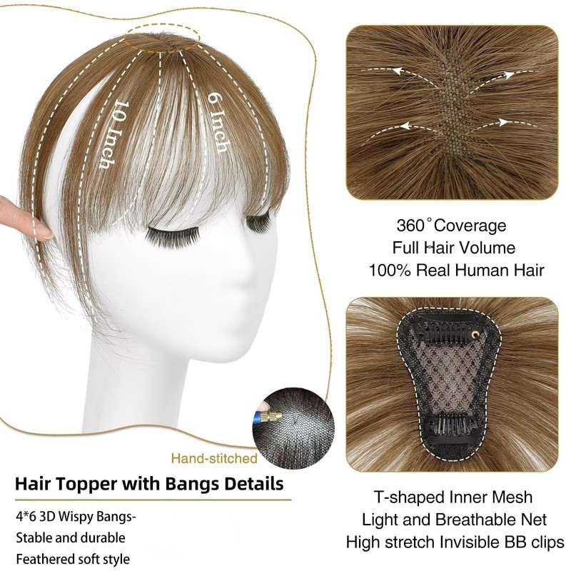 - ☛[Go-To Hair Topper]: Our real human hair topper can perfectly solve the problems of thinning hair, hair loss, baldness, receding hairline, and graying hair roots. It has air bangs that can get the volume of your hair and a nice bangs style in seconds.