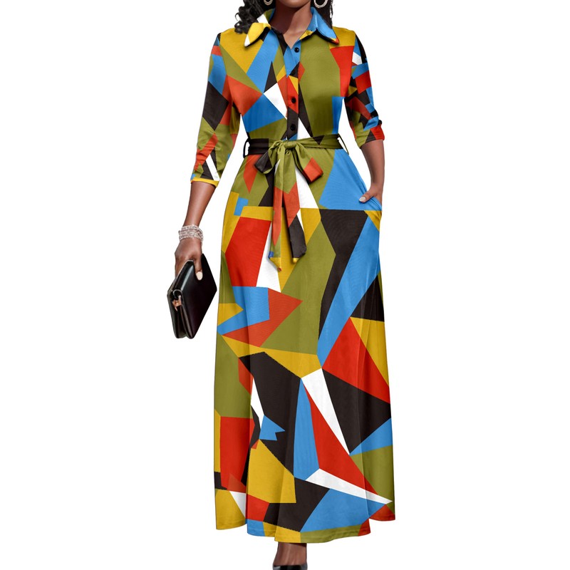 Runwind African Attire for Women Maxi Button Down 3/4 Sleeves Print Dress Casual with Pockets