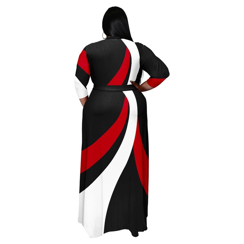 Runwind Plus Size Maxi Dress 3/4 Sleeve V Neck Plus Size Evening Party Dresses Red Black Stripe 3XL