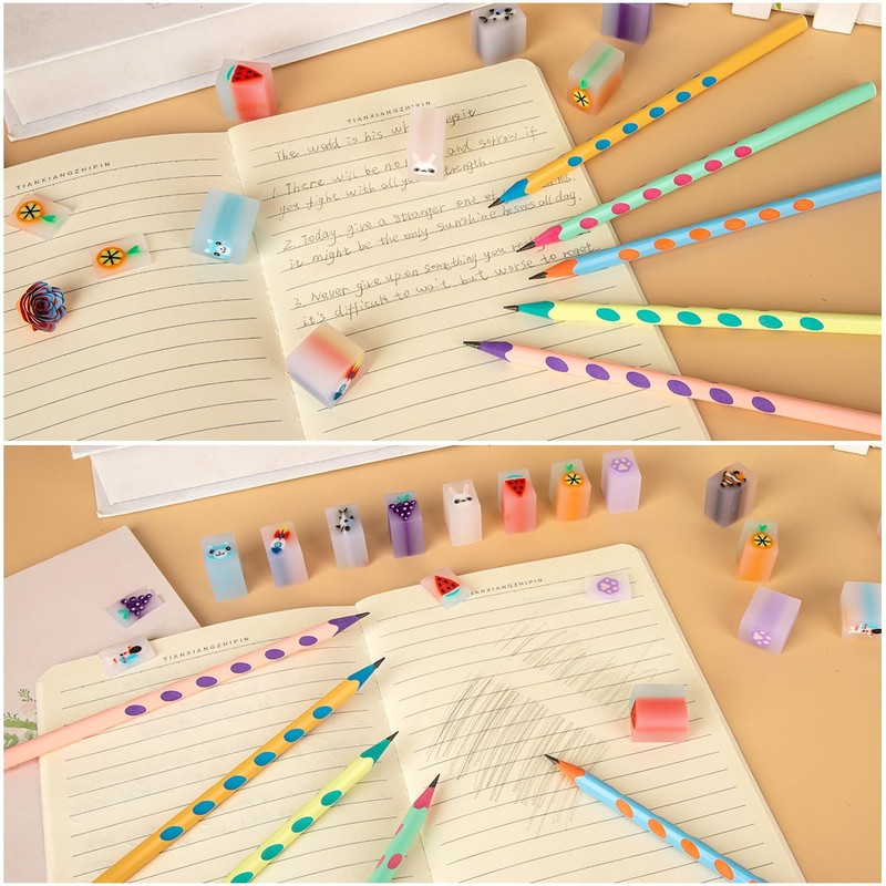 32 triangular pencils with holes + 32 cute erasers, including transparent and animal shapes, subvert traditional stationery and bring creativity and fun to children.