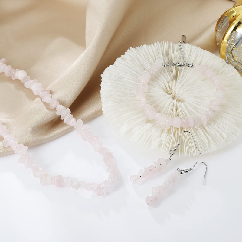- Adjustable Size: The rose quartz necklace length is about 16.5"(42 cm), matching a 2.0" extender chain to fit most necks'sizes. The rose quartz bracelet length is about 6.3"(16 cm), matching a 2.0" extender chain to fit most wrist. The rose quartz earrings total length is about 2.2"(5.6 cm)