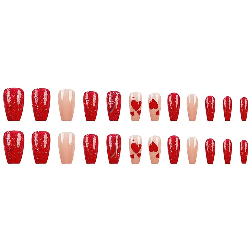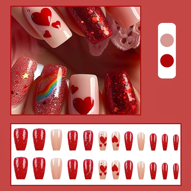 RUOKEXIN Medium Press on Nails Coffin Fake Nails Red Glitter False Nails with Heart Designs Rainbow Ombre Glue on Nails Sparkly Artificial Nails Cute Stick on Nails for Women 24Pcs