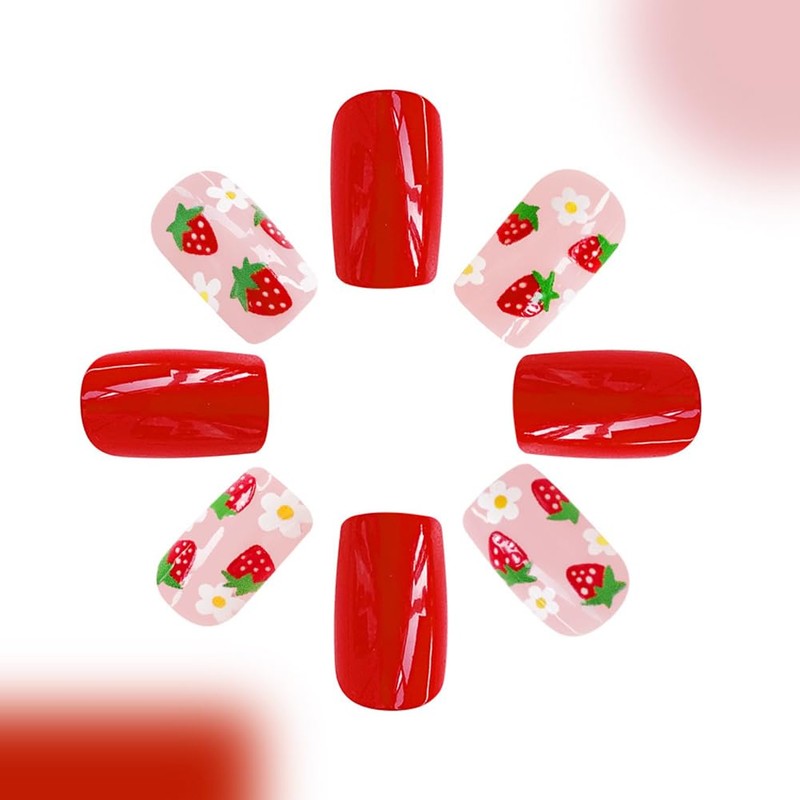 RUPOFUZA Press on Nails Square Short Fake Nails Red False Nails with Lovely White Flowers and Strawberries Design Acrylic Artificial Nails Extra Short Glue on Nails for Women Girls 24Pcs