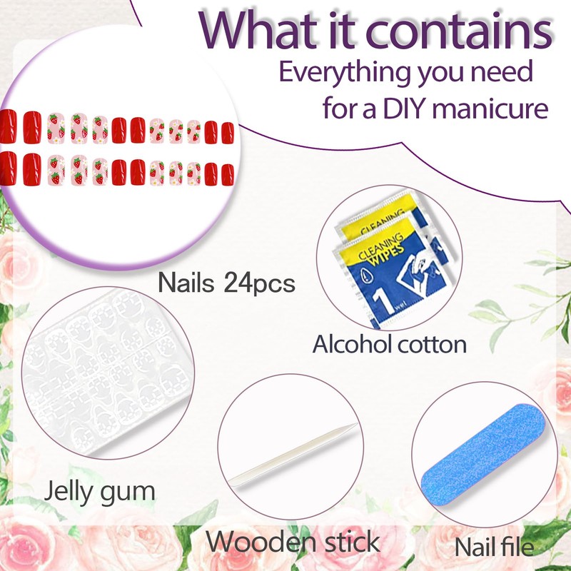 - 💖【Short false nails Package】- 24pcs/12 sizes short nails, 1 nail file, 1pcs jelly glue,1 pack of wipes, 1 small stick. (Durability of jelly glue is not as good as liquid glue, but it makes fake nails reusable,Please use suitable glue according to different scenes).