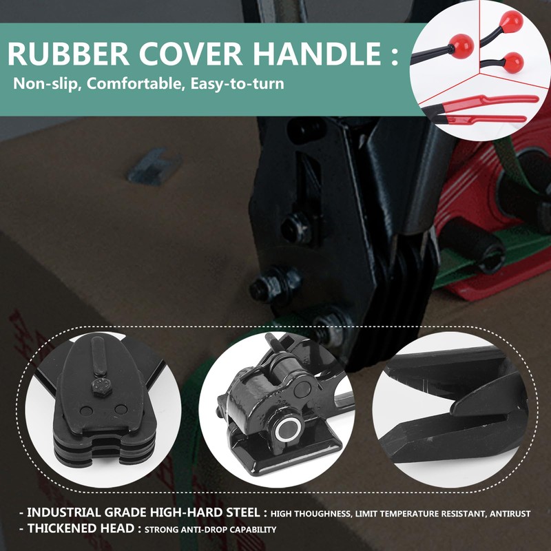 【Labor-Saving and Easy-to-Use】: Ergonomic design on manual tools' handle with non-slip, comfortable rubber cover. Easy-to-turn handle secure strapping's tensioning, crimping & sealing and cutting action is fast and agile.