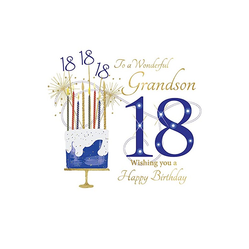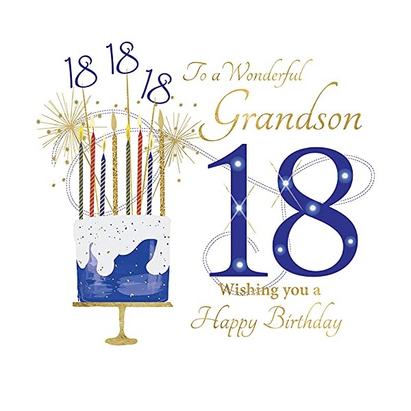 - WONDERFUL DESIGN: featuring a birthday cake with sparkling '18' candles, with stars and gold flitter. The wording on the front of the card reads "To a Wonderful Grandson 18 Wishing you a Happy Birthday" in gold foil. The card features 3D sequin handcrafted embellishments and comes with a coordinating envelope.