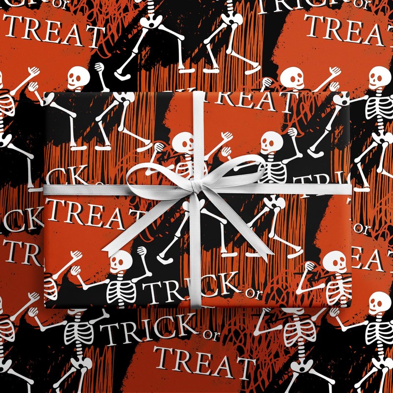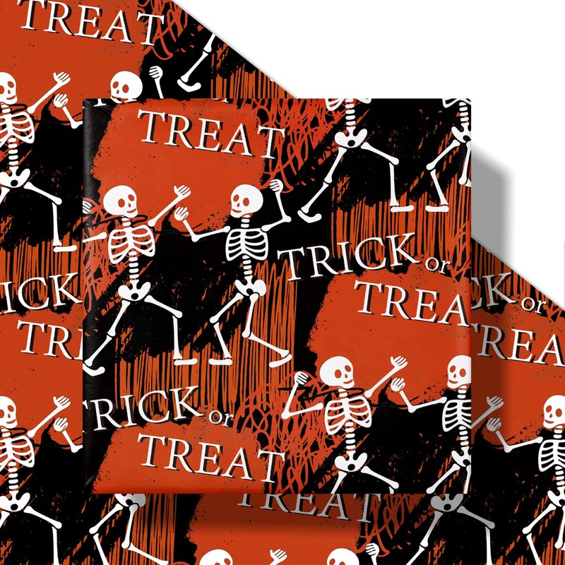 RUSPEPA Halloween Wrapping Paper Roll for Teens Adults, Mini Roll, Dancing Skeletons and Trick or Treat Text Design, Grunge Style Black Orange Gift Wrap for Halloween Party, 17 Inches x 16.4 Feet