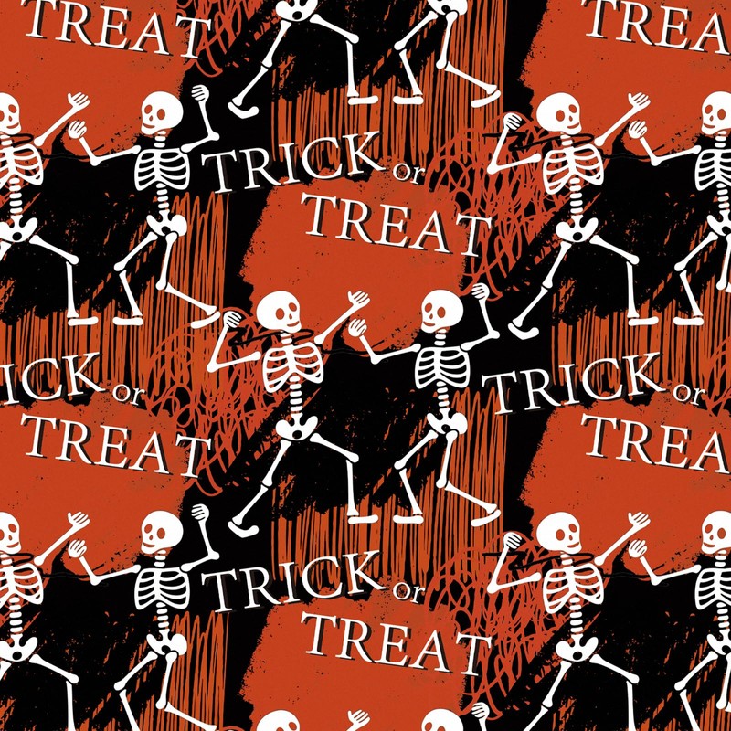 - Grunge-Inspired Halloween Design: Features a bold and edgy mix of dancing skeletons, eerie black shadows, distressed textures and graffiti-style "Trick or Treat" text. The black and orange palette brings a modern and rebellious Halloween vibe