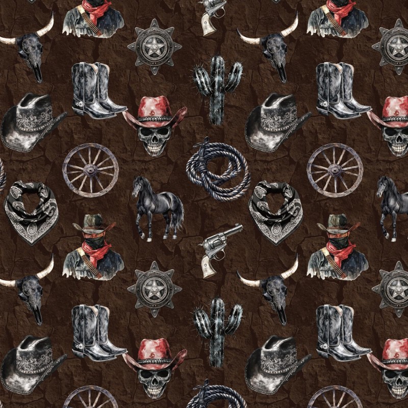 - Rustic Western Design: Features cowboy-inspired elements including skull with hat, boots, revolver, cactus, rope, sheriff badge, bull skull, wagon wheel and horse, all on a rugged brown background