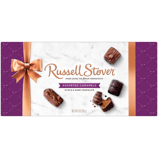 Russell Stover Assorted Caramels in Milk and Dark Chocolate, Mother's Day Chocolate Gift Box, 9 Ounce