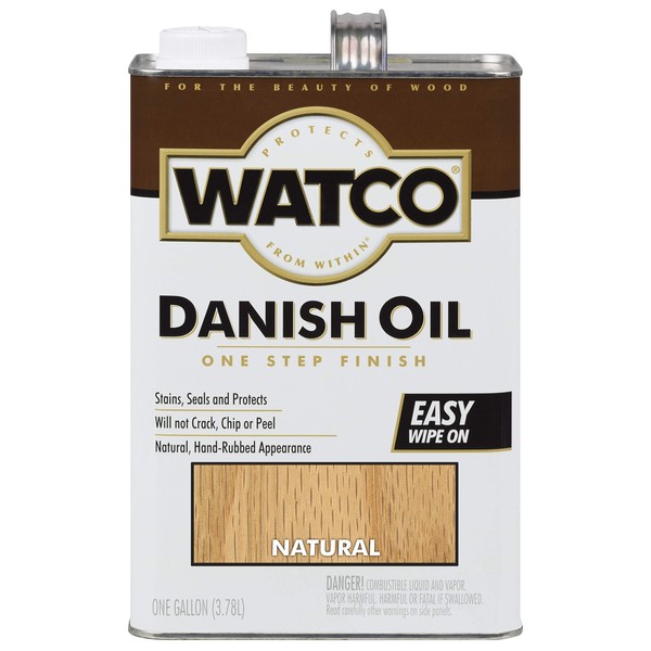 Watco Gallon Natural Danish Oil Wood Finish. Creates rich, warm glow of a hand-rubbed finish. Oil-based formula penetrates deeply into wood pores. Protects against spills, abrasion and chipping. Can be used on bare wood or stripped and sanded wood. Has superior performance on tight grained woods. VOC Compliant Replaces True Value# 762-156 For South Coast Counties CA.