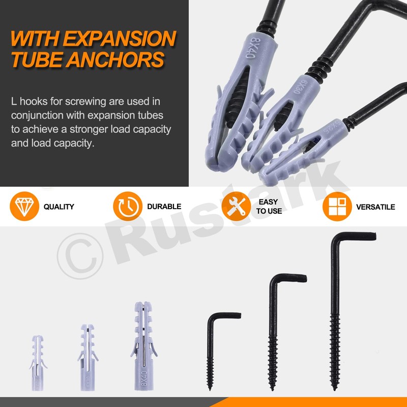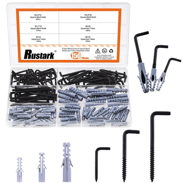 Rustark 150Pcs 3 Sizes Black Square Bend Hook Kit with Expansion Tubes L Shaped Screw in Hooks Spiral in Square Bend Hook for Hanging Workplace Home Office