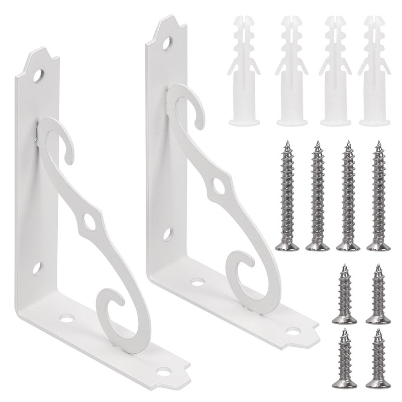 - 【 What's Included 】 ---- Package comes with 2 x 5" white decorative shelf brackets, 4 x wall anchors, 4 x long screws, 4 x short screws. Total 14pcs. These L-shape shelving brackets are suitable for various wall types, including cement wall, ceramic tile wall, brick wall, and solid wall.