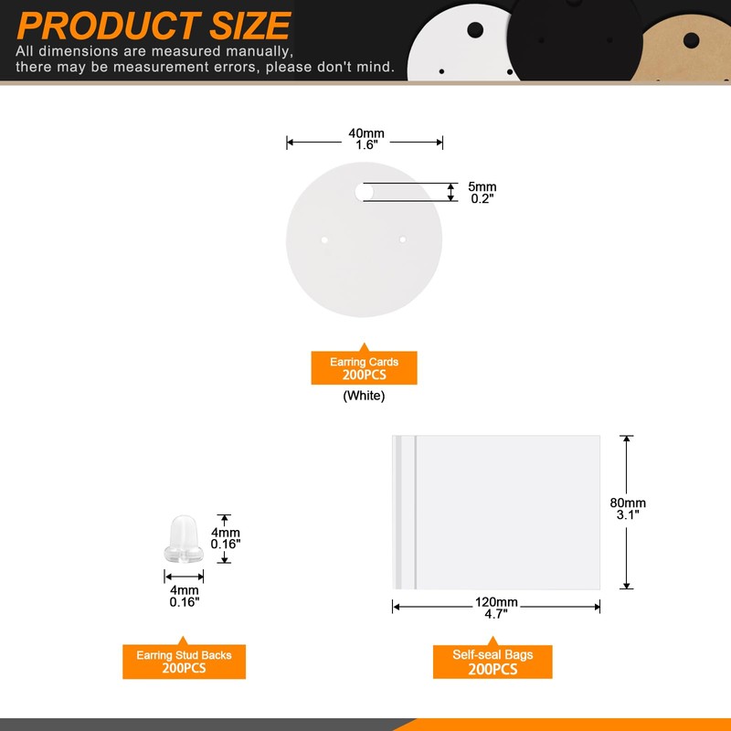 • 【 What’s in the package? 】 --- This earring cards set includes 200pcs white earring display cards + 200pcs silicone earring backs + 200pcs self-sealing bags. Total 600pcs meets your needs of personal packaging or business usage.