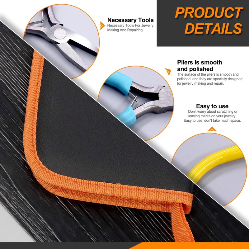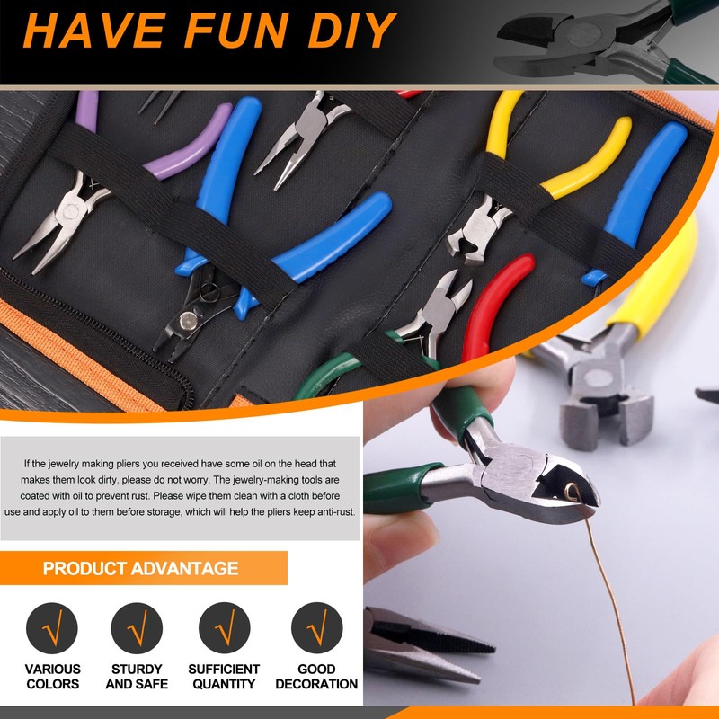 - 【 WHAT YOU GET 】 ----- The jewelry making supplies kit includes 1 long nose pliers, 1 diagonal wire cutter, 1 round nose pliers, 1 bent nose pliers, 1 end cutting pliers, 1 bail making pliers, 1 bead crimping pliers, 1 split ring pliers, and 1 storage bag. This complete professional jewelry pliers set can meet your various crafting and jewelry making repair projects.