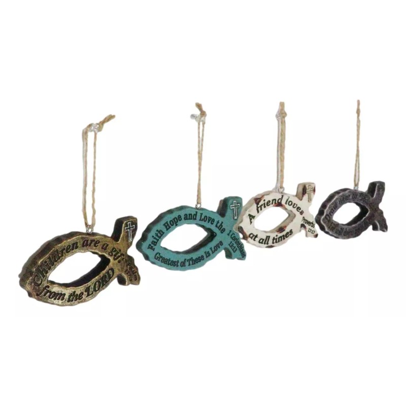 Ebros Rustic Bible Scriptures Christian Fish Ichthys Christmas Tree Ornaments Set of 4