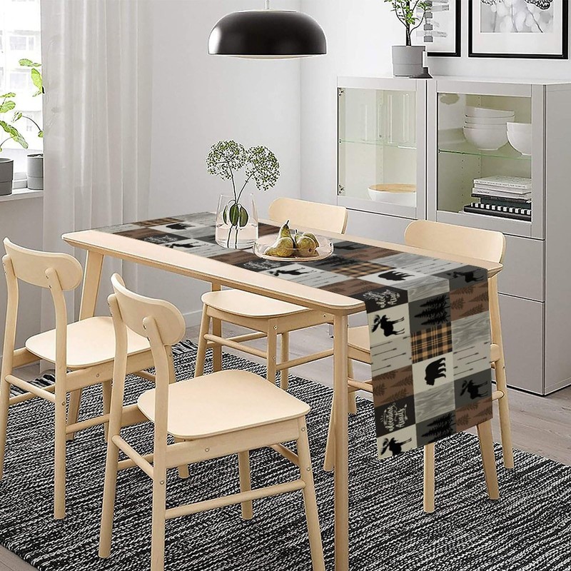 Rustic Cabin Bear Table Runner Retro Deer Moose Hunting Country Plaid Art Printed Runner for Home Kitchen Dining Table Living Room Decor Fabric 1 Panel W13xL36in