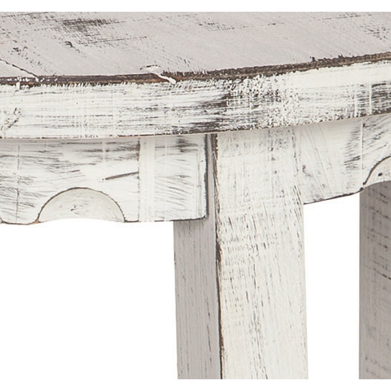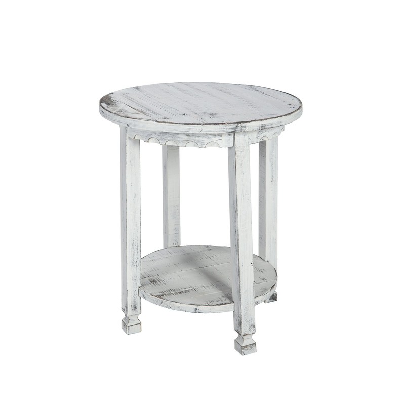 - Distressed finish round end table offers farmhouse style and functional design; Dental work and square, turned legs offer cottage style