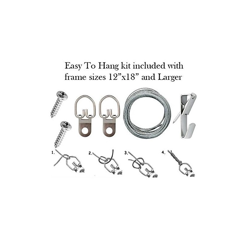 • Frame Sizes 12"x18" and larger include: .060 framing grade clear acrylic, rigid cardboard backing and wire hanging hardware kit (some assembly required).