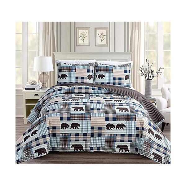 Rustic Modern Farmhouse Cabin Lodge Stripe Quilted Bedspread Coverlet Bedding Set with Patchwork Grizzly Bears and Buffalo Plaid Check Patterns Beige Blue - Western 2 (Twin)