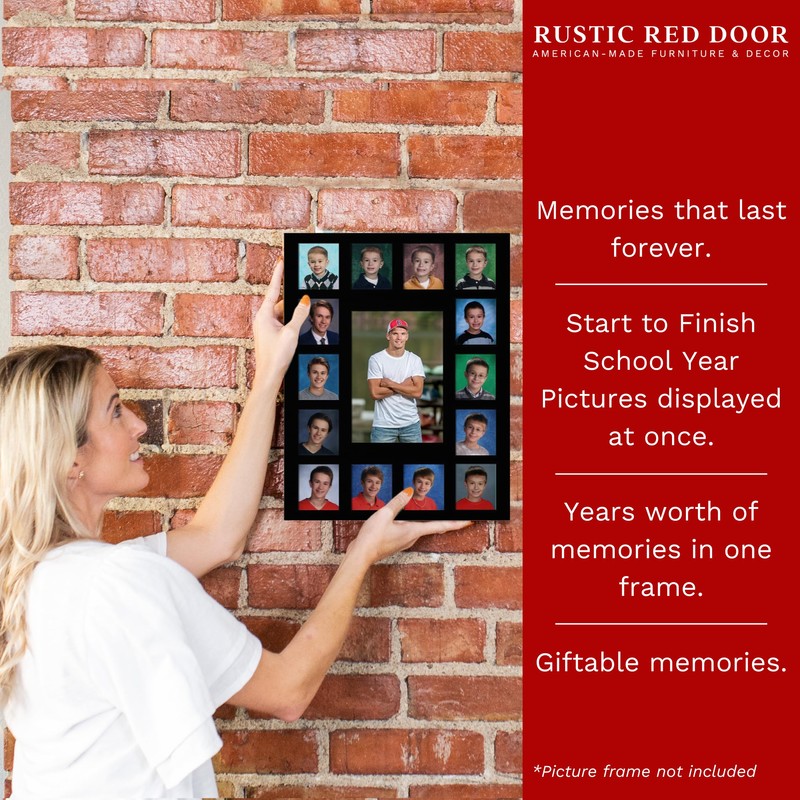 - Black Pre-School-12th Grade Photo Mat (No Frame Included): Warmly reminisce on your child’s younger years with Rustic Red Door’s photo collage frame mat. The pre-school to graduation 2037 mat is designed with 15 spaces for your son or daughter’s photographs from pre-school through graduation.