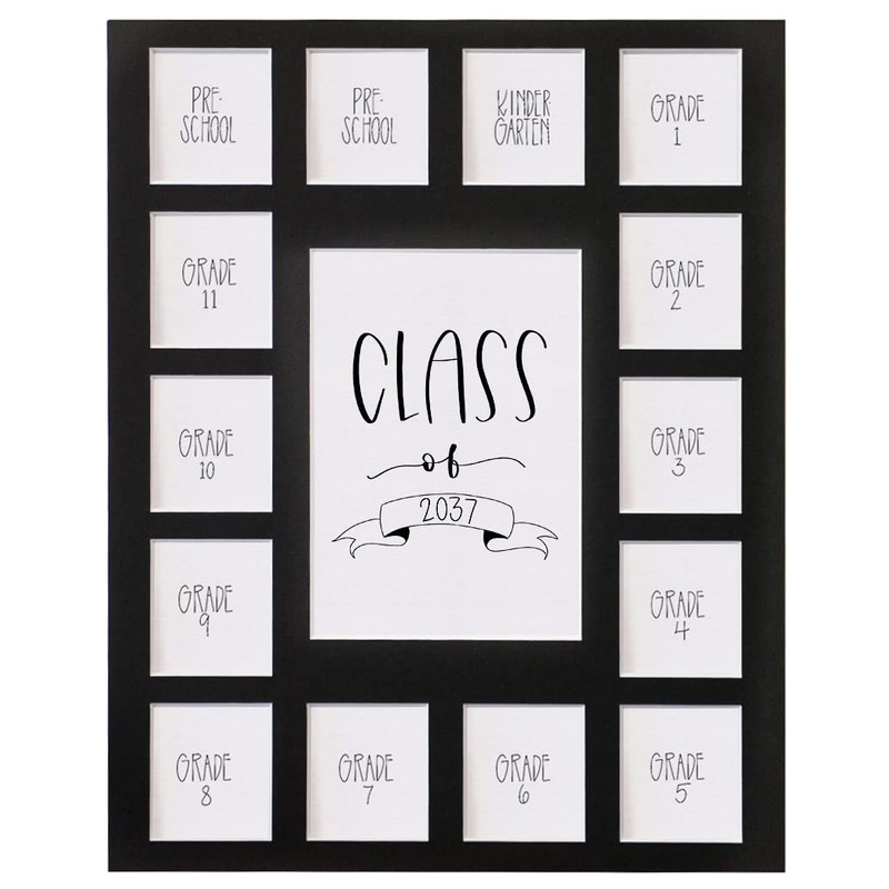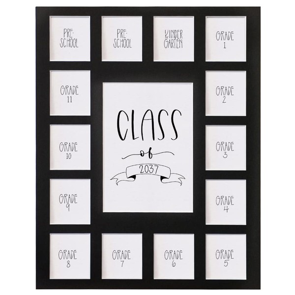 - Class of 2037: The center of the black mat photo frame features the text: “Class of 2037”. The pre-school to graduation frames mats include fourteen 2” x 2” wallet-sized spaces for photos from pre-school through 11th grade with one large 5” x 7” center space for a Class of 2037 yearbook photo. When your child graduates, display this mat for memorable, personalized 2037 graduation party decorations.