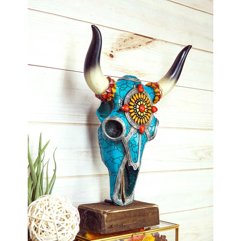 • This Bull Cow Skull With Turquoise Aztec Sun Design Desktop Sculpture is made of designer composite resin, hand painted and polished individually. Color Tone may vary slightly from photos.