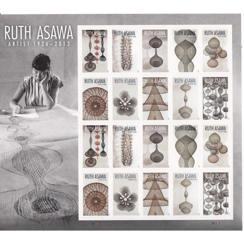 Ruth Asawa U.S. Forever Stamps Pane of 20 Stamps Ruth Asawa Artist 1926-2013 Inspired by nature, Japanese American artist Ruth Asawa transformed industrial material into transparent and seemingly weightless works of art that challenged traditional definitions of sculpture.