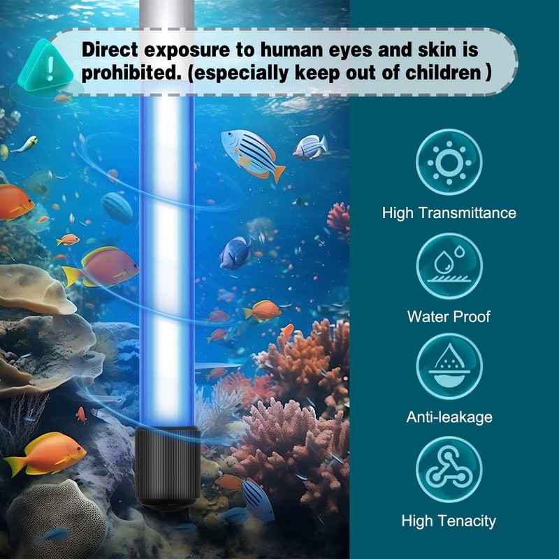 - 🐟【Warm Notice】-Please measure the size of your aquarium and compare with the dimension of our product before purchase. Instructions: Please do not watch the UV lamp for a long time, and avoid the UV lamp irradiating the skin. When using the aquarium disinfection lamp, please put it in the filter, or use an opaque plate to separate the lamp from the fish to avoid direct light shining on your fish and harm them, but please make sure that the water can pass through the plate.