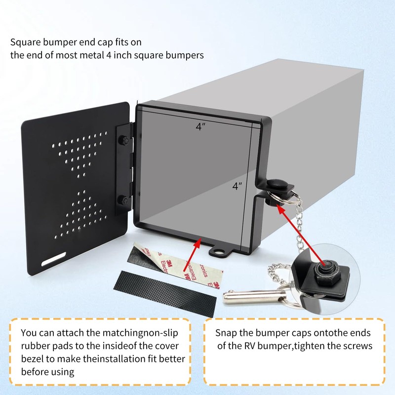 - PRECISE FIT & QUICK INSTALLATION:This camper bumper cap includes 2 non-slip pads can be fixed inside the frame to ensure a tight fit - preventing the cover from coming loose. Works seamlessly as a replacement accessory part for 4-inch square bumper end caps.