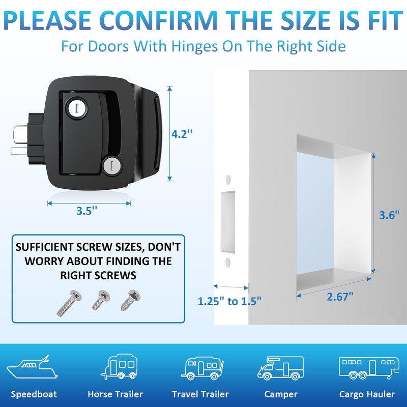 - 【Universal Fit for Most RVs】 Compatible with hole cutouts from 2.5" x 3.5" to 3" x 4" and door thicknesses of 1.25" to 1.5". Fits travel trailers, campers, horse trailers, cargo haulers, and 5th wheels (hinges on right side; not for CLASS A/C RVs). Always confirm your door size before use.