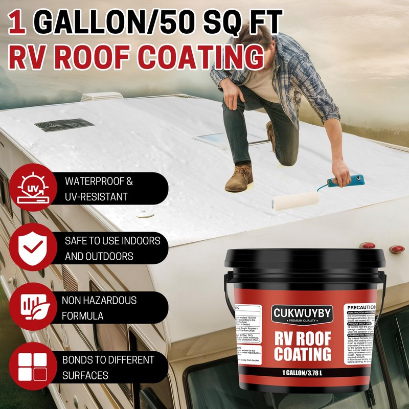 - EASY TO APPLY: Apply with roller, brush, squeegee or sprayer after cleaning surface of dust and debris. Use heavy coats to build up the waterproof membrane. Quick dry for about one hour, if you want to get a better waterproof effect, it is recommended to wait 24 hours before repainting.1 gallon pail will coat RVs up to 50 sq ft.