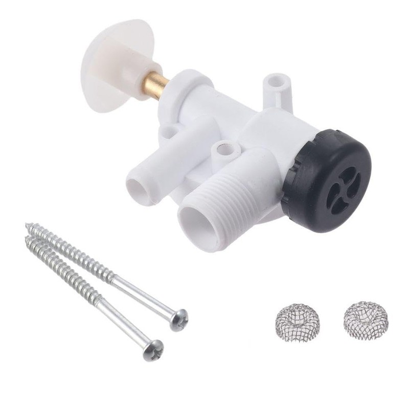 Package: The package includes 1 x RV Toilet Water Valve, 2 x Mounting Screws, 2 x Stainless Mesh Filters, providing you with all the necessary components for a hassle-free installation.