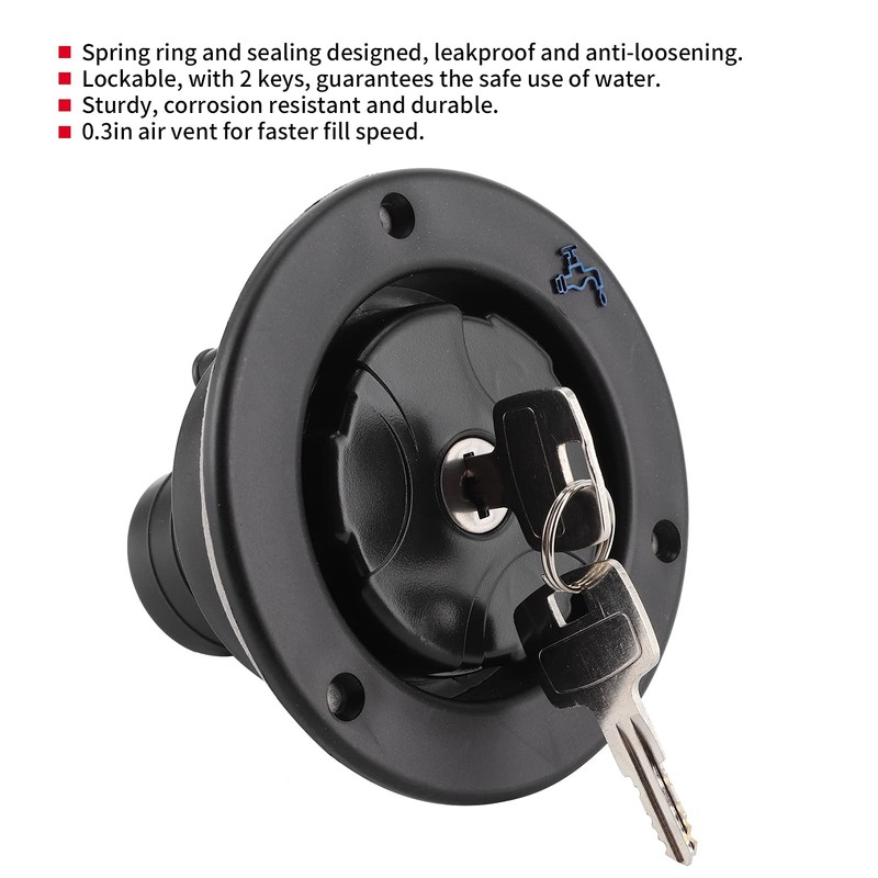 <p>With a bayonets‑style lid, 0.3in air vent for faster fill speed and 1.6in barn connection.</p><p>The design of spring and sealing rings can effectively prevent leakage and loosening.</p><p>Lockable design, comes with 2 keys, guarantees the safe use of water.</p><p>Suitable for the door plate with 30‑40mm/1.18 ‑ 1.57in thickness.</p><p>Made of high quality plastic material, sturdy, corrosion resistant and durable.</p><p><br></p><p><br></p><p>Item Type: Water Filler Cap</p><p>Material: Plastic</p><p>Color: Black</p><p>Application: Suitable for the door plate with 30-40mm/1.18 - 1.57in thickness.</p>
